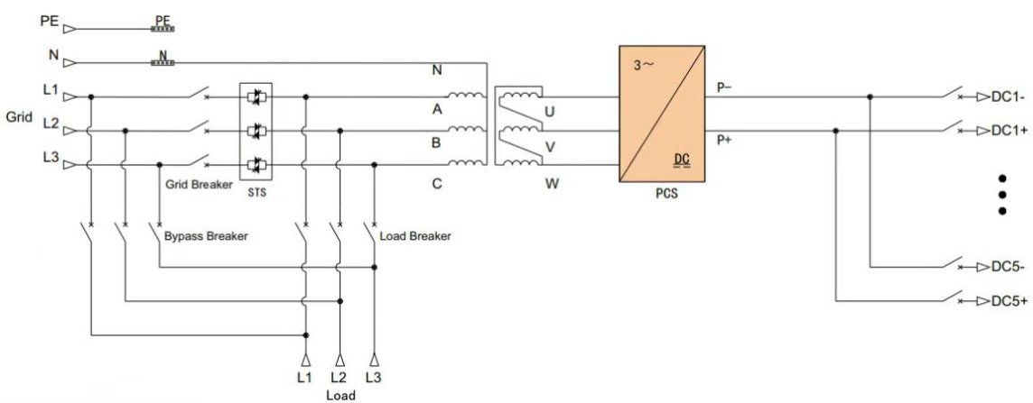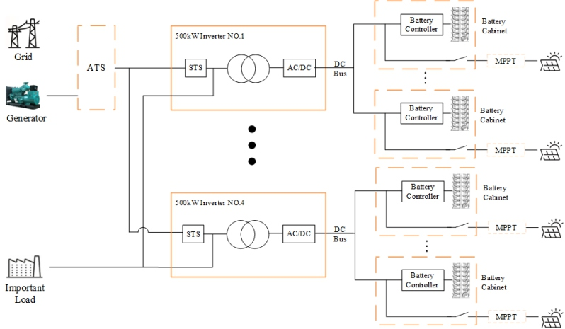 2. عند تشغيل أنظمة متعددة بقدرة 500 كيلووات بالتوازي وتوزيع STSaعبر محولات مختلفة بقدرة 500 كيلووات، من الضروري التأكد من أن طول الكابل من نقطة ربط الشبكة إلى نقطة ربط الحمل ثابت؛